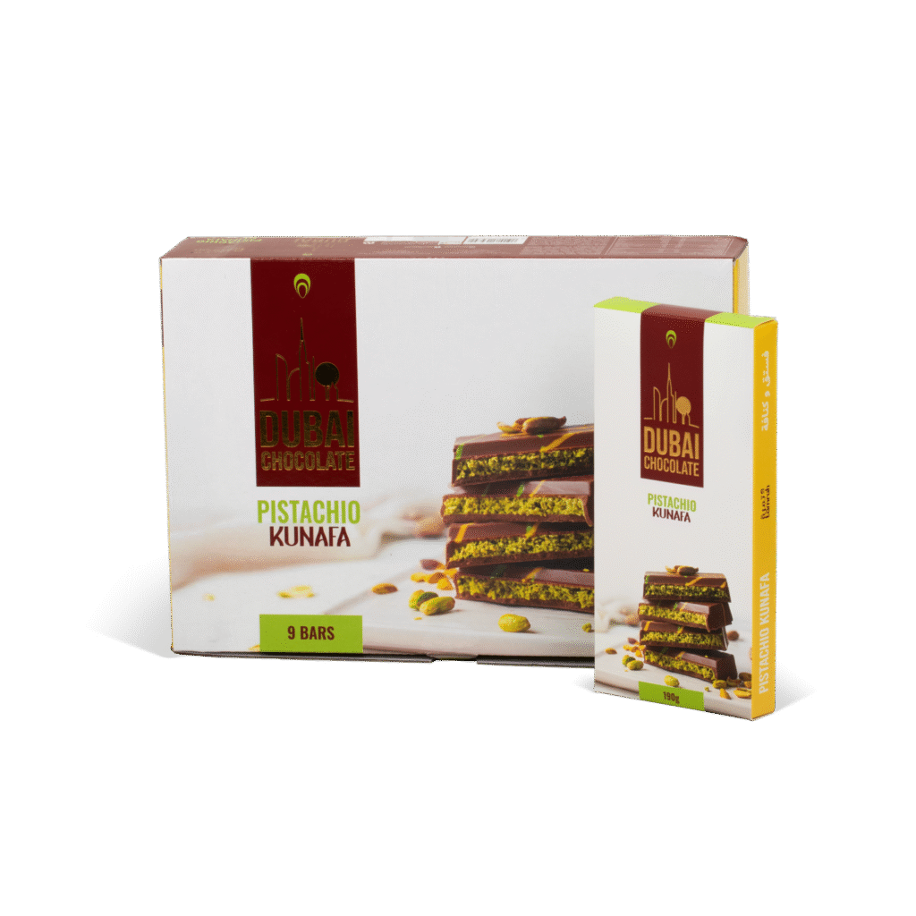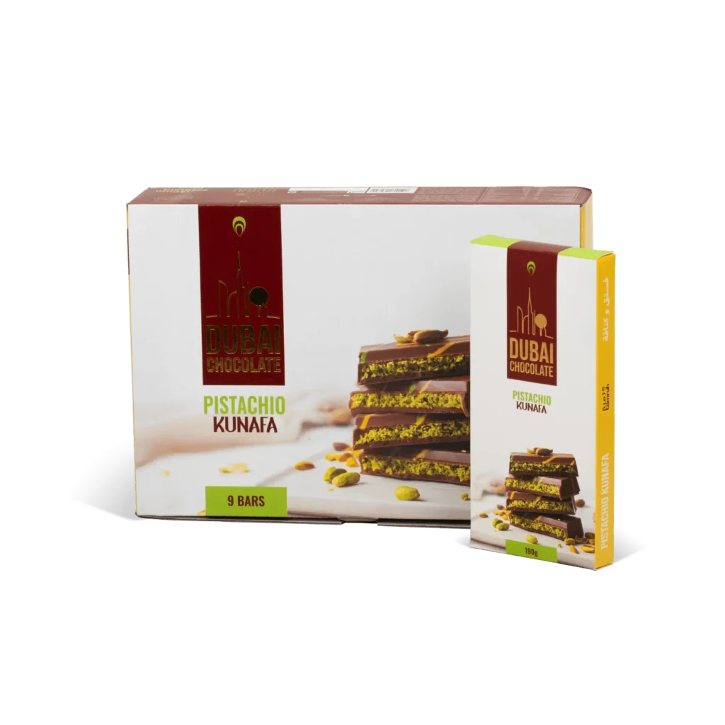 A rich fusion of creamy white chocolate, crunchy kunafa, and premium pistachio inspired by Dubai’s iconic dessert for an irresistibly smooth and crispy bite.